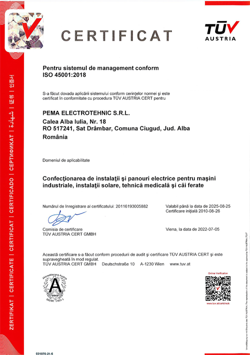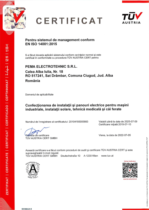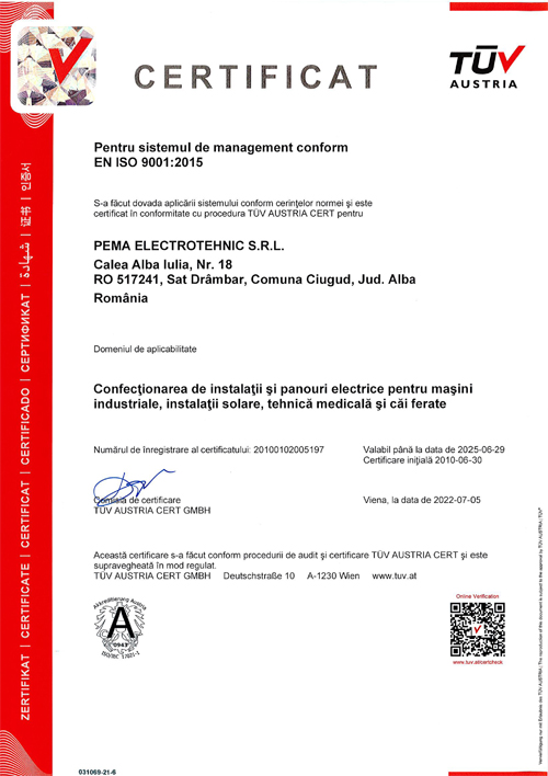 pema electrotehnic Romania dispune de urmatoarele certificari: